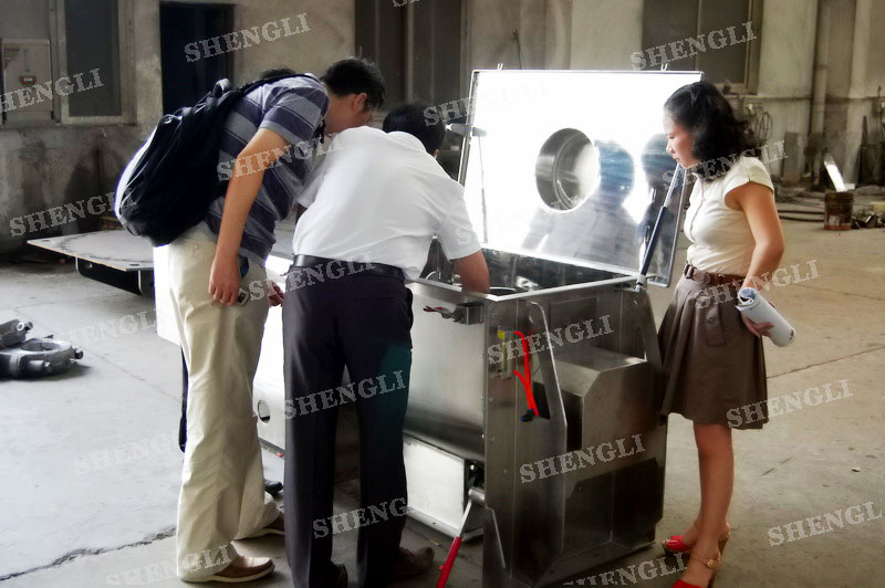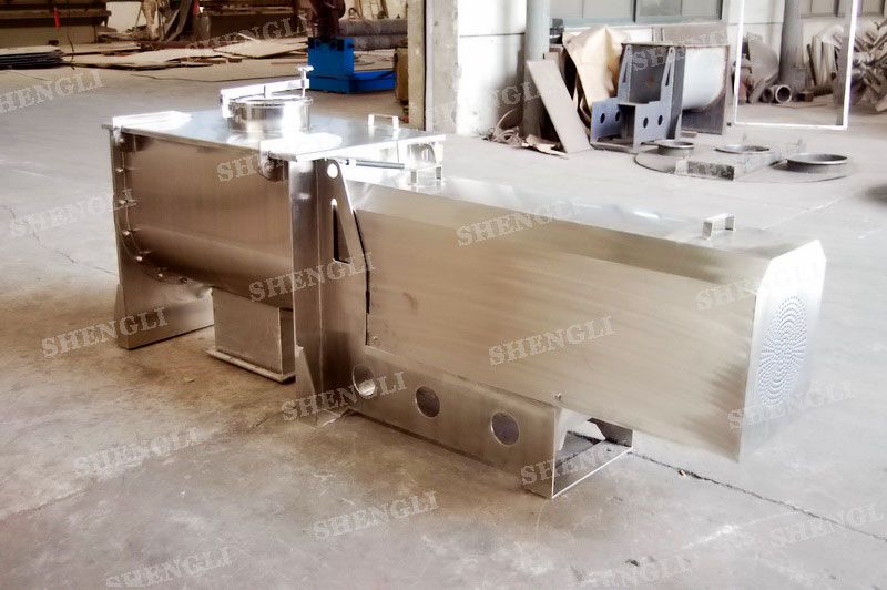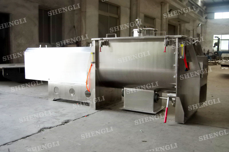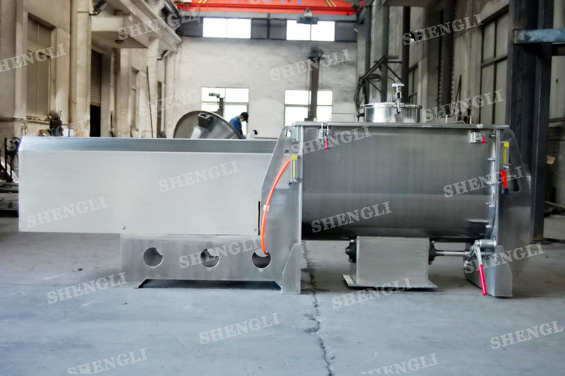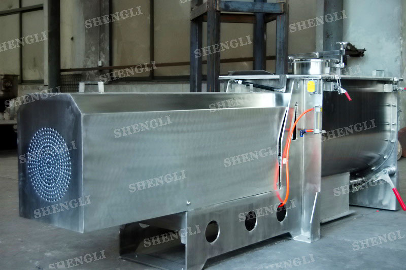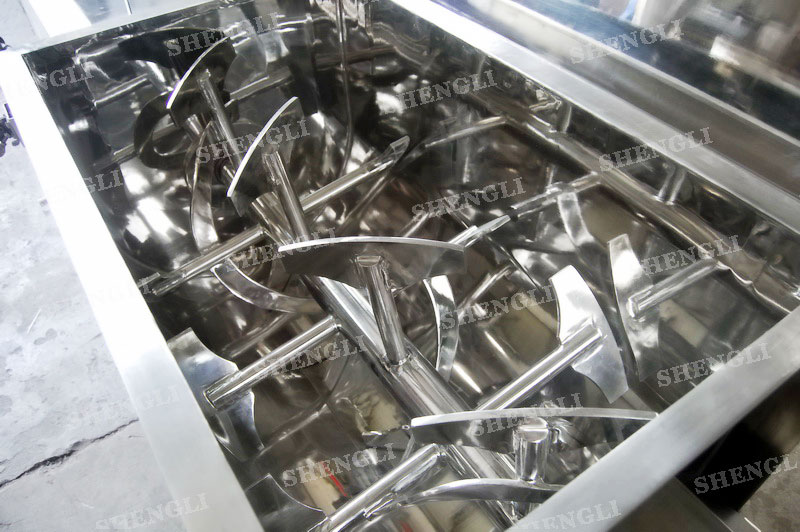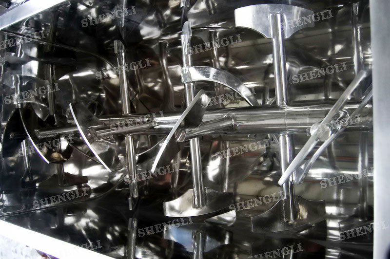 工作原理:桨叶式混合机采用U型筒体,内设平行主轴,主轴上安装若干倾角式桨叶刀,不仅能快速高效的搅拌物料,且不会破坏物料,不会卡料。