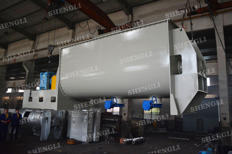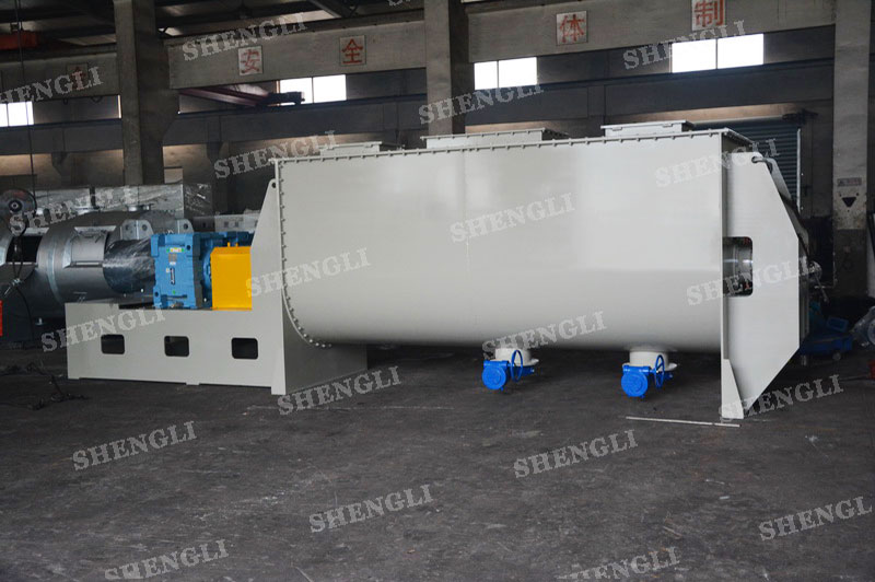 工作原理:卧式搅拌机采用U型筒体,内设平行主轴,主轴上安装若干倾角式桨叶刀,不仅能快速高效的搅拌物料,且不会破坏物料,不会卡料。