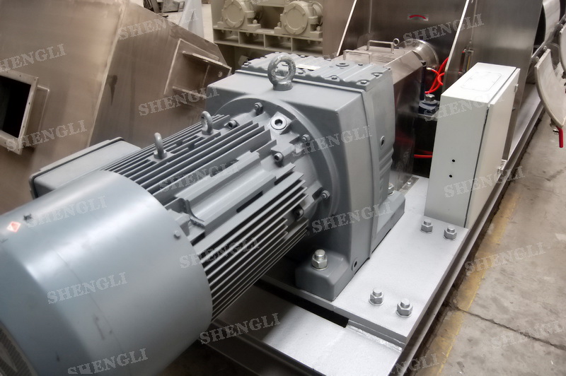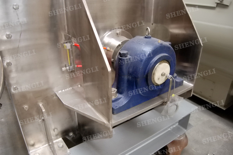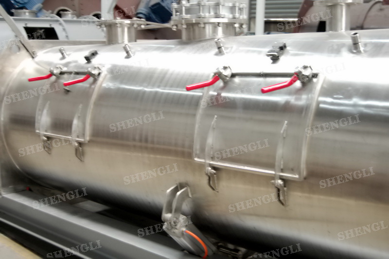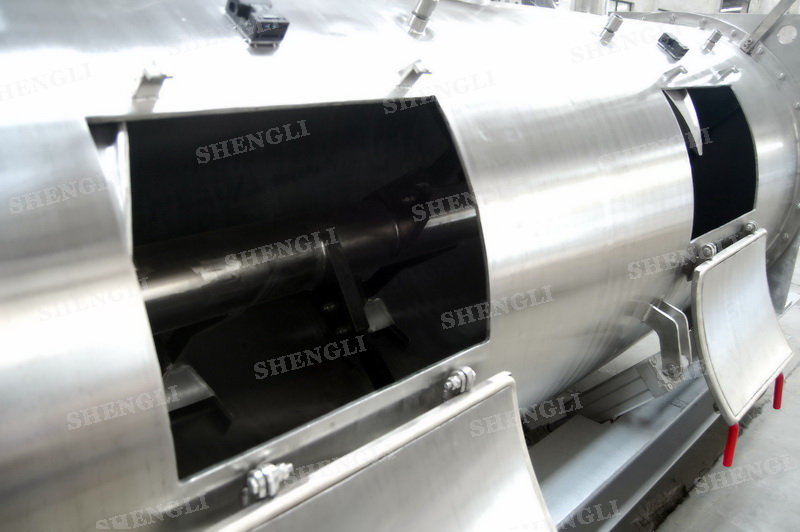 设备配置:配置SEW品牌R系列减速机,平行安装;筒侧开设快开式检修门附安全开关;出料口采用气动翻板阀;筒体上设置喷液喷头;设备主轴采用气密封;设备内、外表面拉丝亚光。