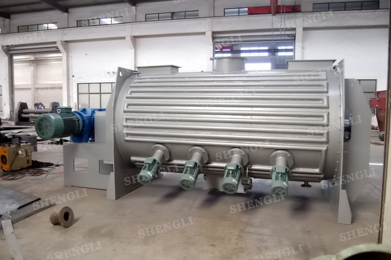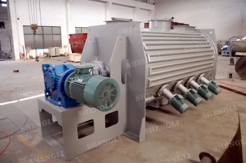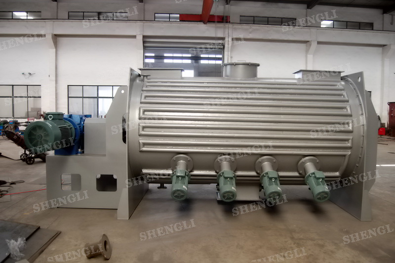 工作原理:犁刀卧式混料机采用卧式圆柱筒体,内设平行主轴,主轴上安装若干犁式刀头,通过较快的旋转速度,分割、重合物料,实现快速搅拌的功能,常结合1500-3000转高速剪切飞刀相互作用。