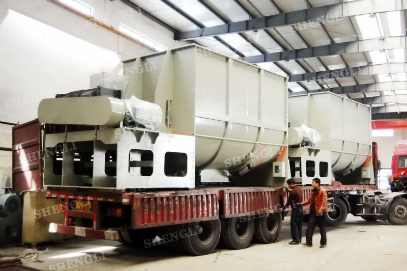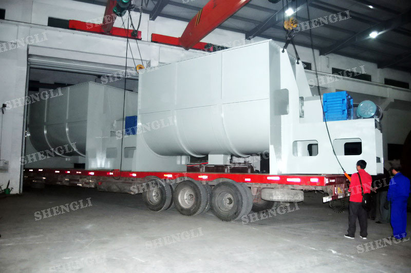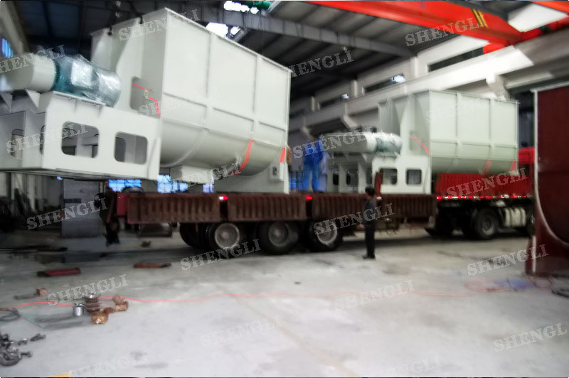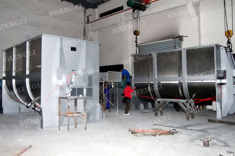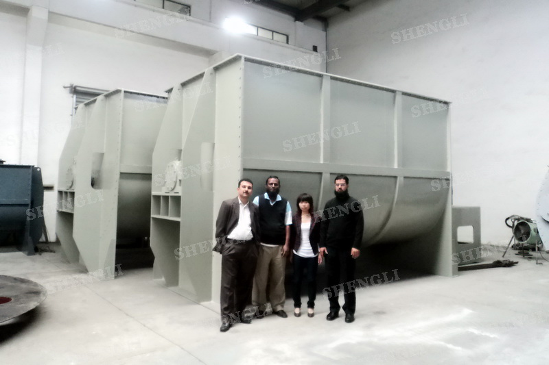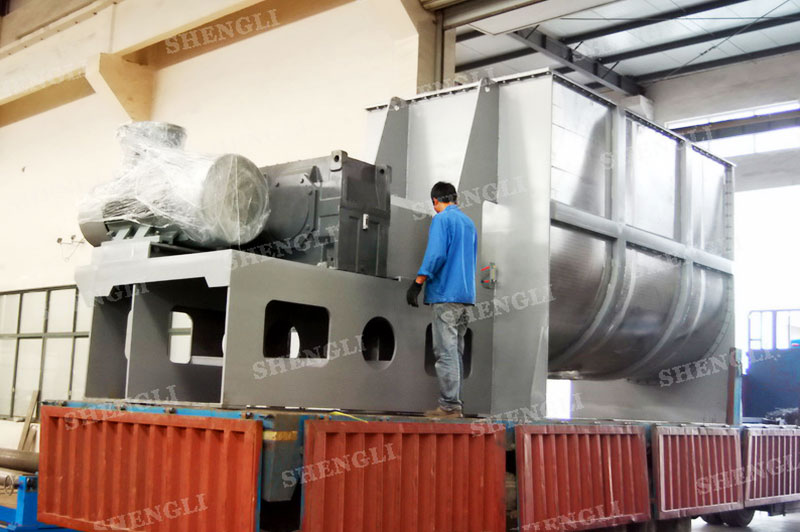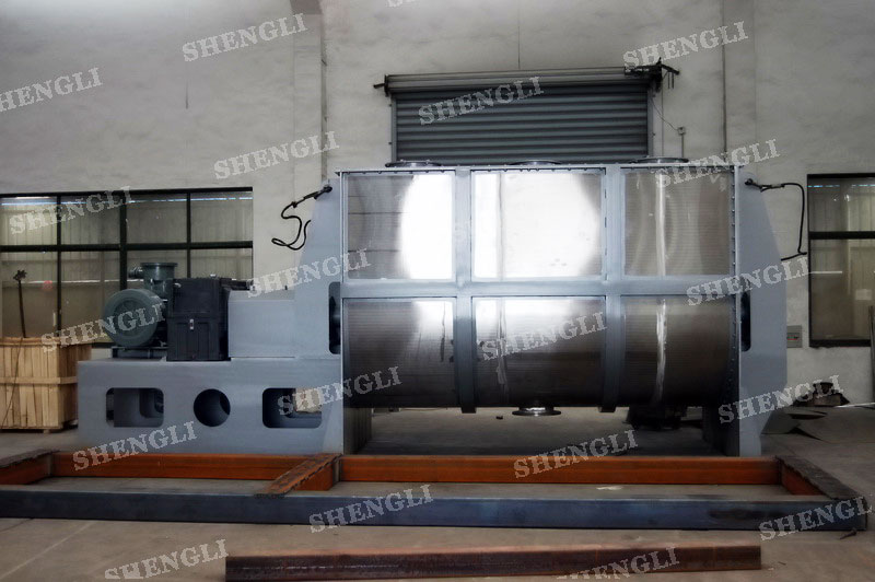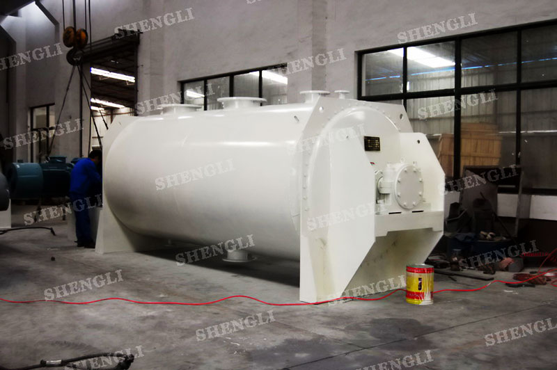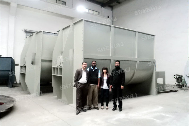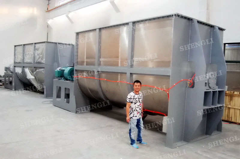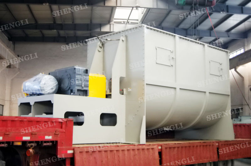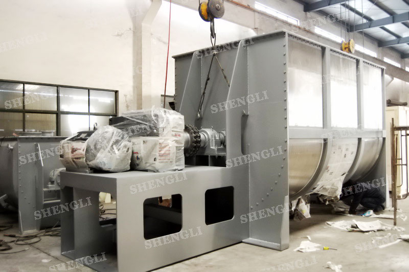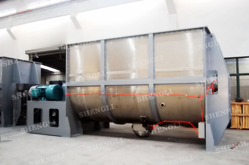 工作原理:螺带大型混合机采用U型筒体,内装平行主轴,主轴上安装正反双向的盘条螺带,不同维度螺带分内螺带与外螺带,物料在螺带的驱使下反复参混,能够快速高效的混合。