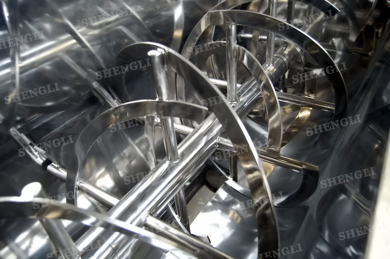 工作原理:螺带螺带条式混合机采用U型筒体,内装平行主轴,主轴上安装正反双向的盘条螺带,不同维度螺带分内螺带与外螺带,物料在螺带的驱使下反复参混,能够快速高效的混合。
