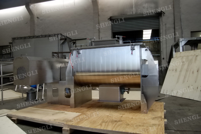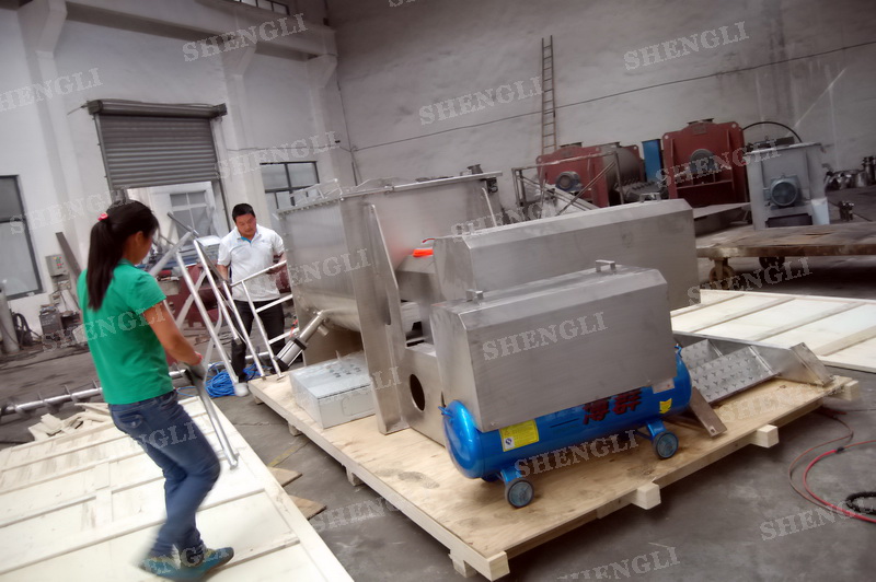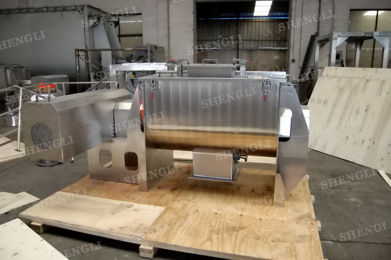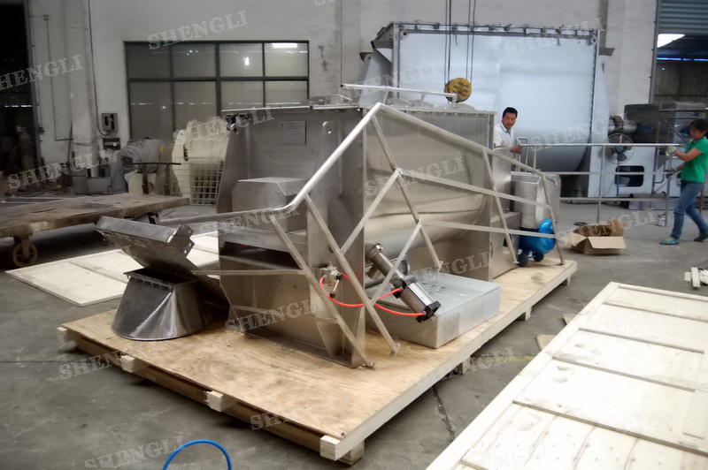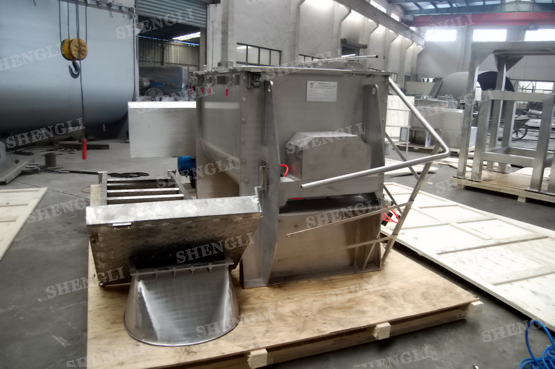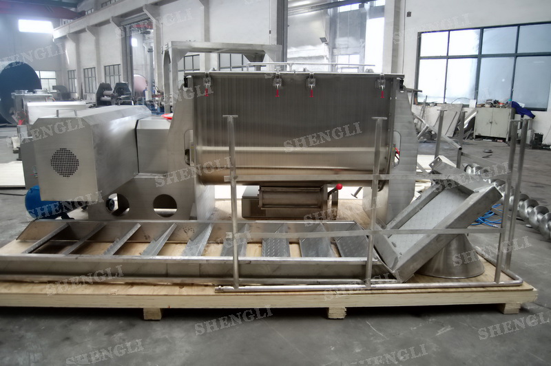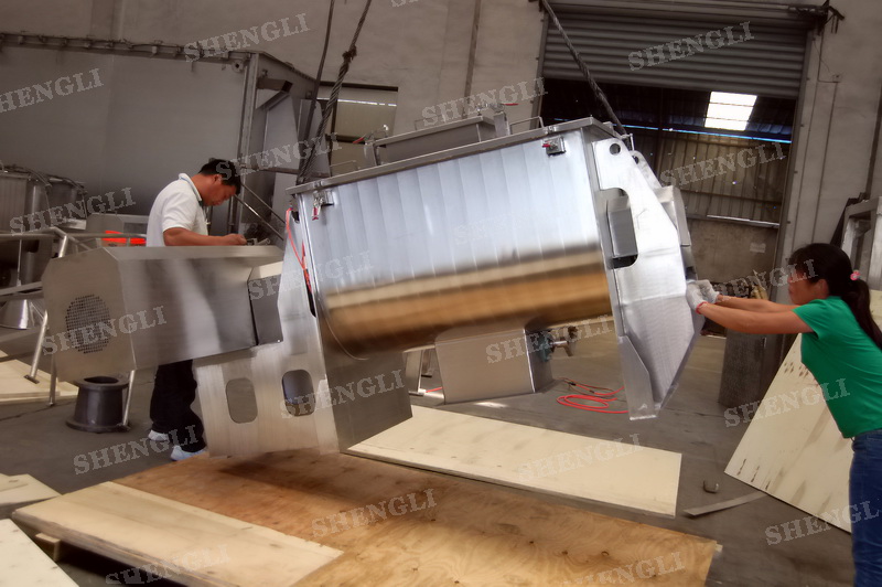 工作原理:螺带式混合机采用U型筒体,内装平行主轴,主轴上安装正反双向的盘条螺带,不同维度螺带分内螺带与外螺带,物料在螺带的驱使下反复参混,能够快速高效的混合。