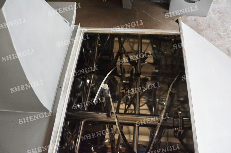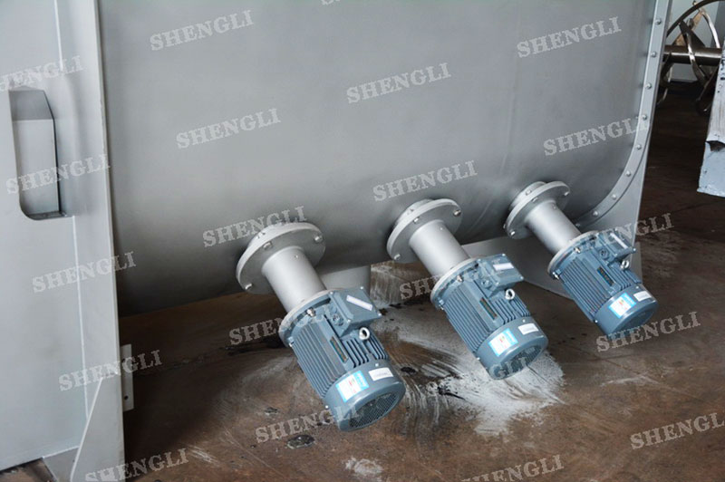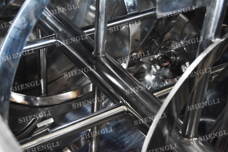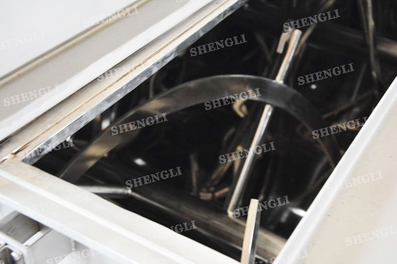 工作原理:螺带卧式混合机采用U型筒体,内装平行主轴,主轴上安装正反双向的盘条螺带,不同维度螺带分内螺带与外螺带,物料在螺带的驱使下反复参混,能够快速高效的混合。