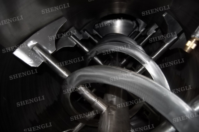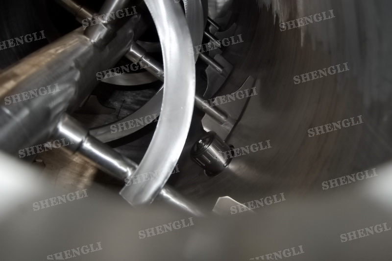 设备配置:配置K系列减速机、垂直安装;设备采用圆形筒体;筒侧加装高速飞刀;设备主轴与飞刀主轴采用机械密封;设备内外表面拉丝抛光。