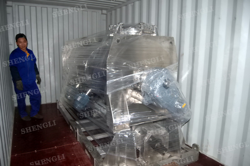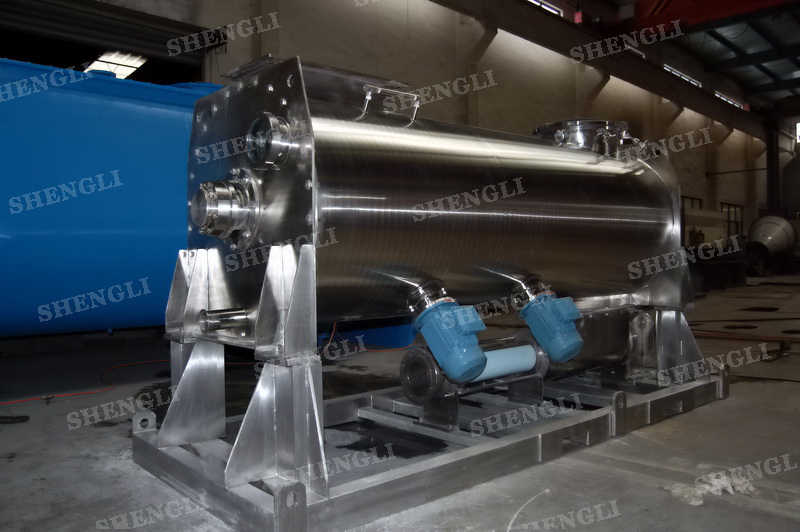 工作原理:螺带搅拌设备采用U型筒体,内装平行主轴,主轴上安装正反双向的盘条螺带,不同维度螺带分内螺带与外螺带,物料在螺带的驱使下反复参混,能够快速高效的混合。