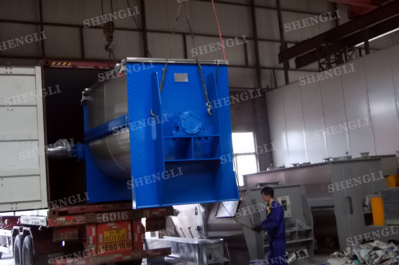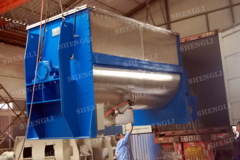 工作原理:螺带搅拌机采用U型筒体,内装平行主轴,主轴上安装正反双向的盘条螺带,不同维度螺带分内螺带与外螺带,物料在螺带的驱使下反复参混,能够快速高效的混合。