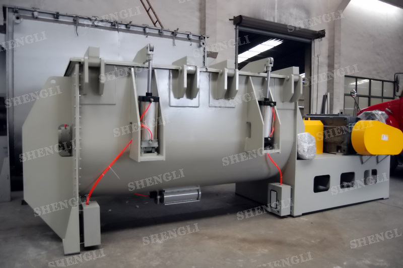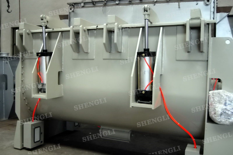 工作原理:螺带卧式搅拌机采用U型筒体,内装平行主轴,主轴上安装正反双向的盘条螺带,不同维度螺带分内螺带与外螺带,物料在螺带的驱使下反复参混,能够快速高效的混合。