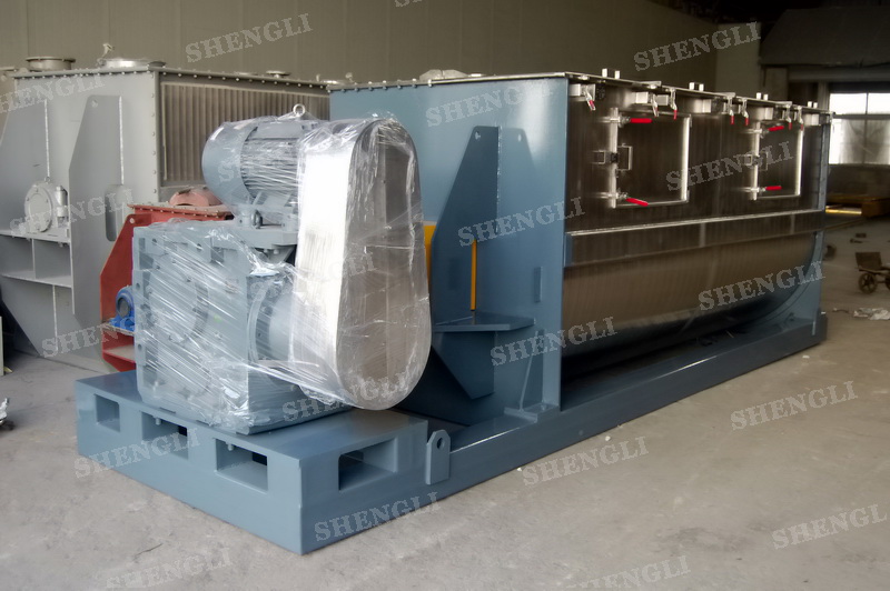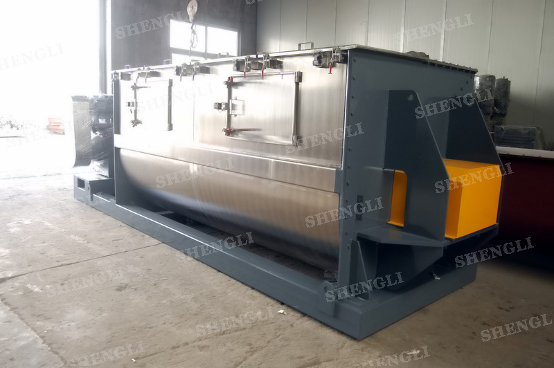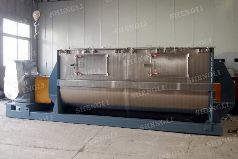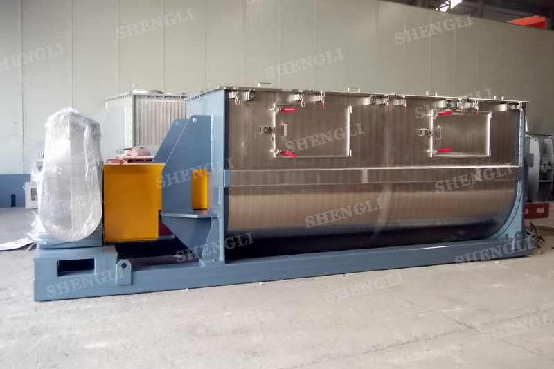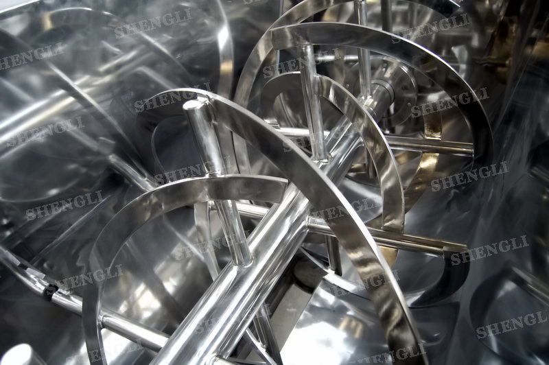 工作原理:螺带卧式混合机采用U型筒体,内装平行主轴,主轴上安装正反双向的盘条螺带,不同维度螺带分内螺带与外螺带,物料在螺带的驱使下反复参混,能够快速高效的混合。