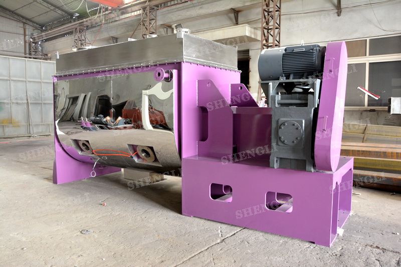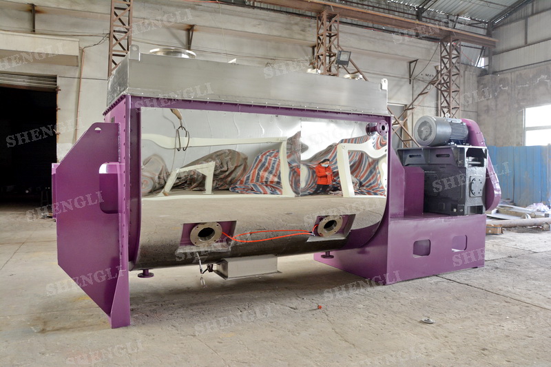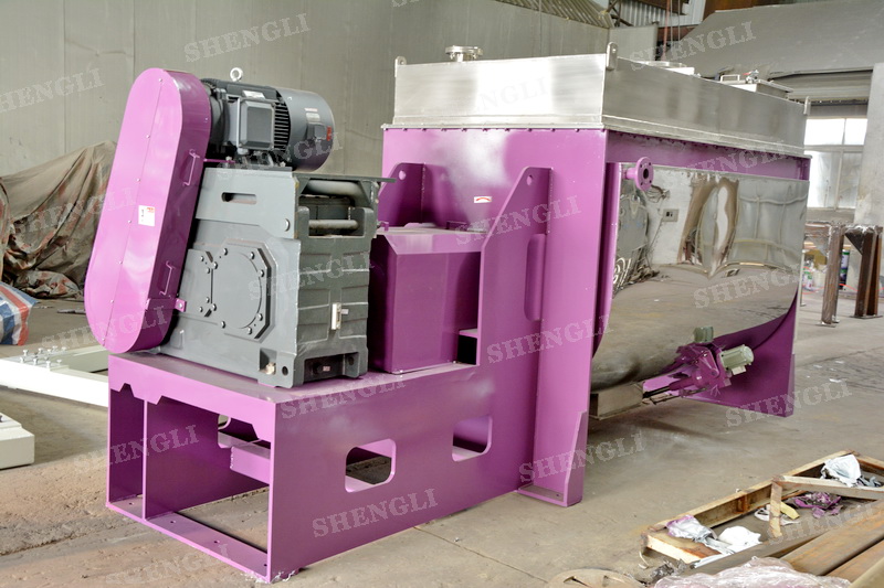 工作原理:螺带卧式搅拌机采用U型筒体,内装平行主轴,主轴上安装正反双向的盘条螺带,不同维度螺带分内螺带与外螺带,物料在螺带的驱使下反复参混,能够快速高效的混合。