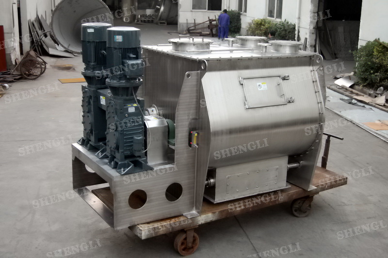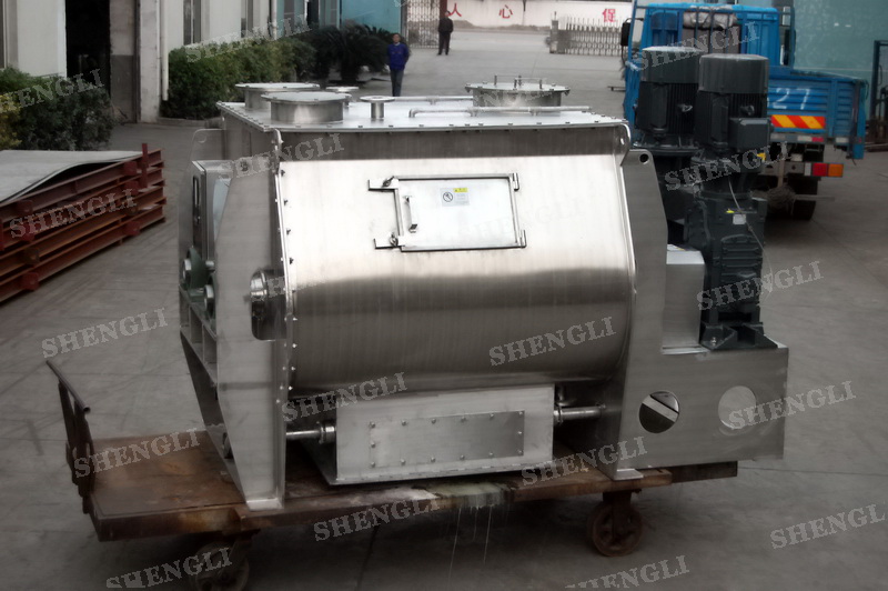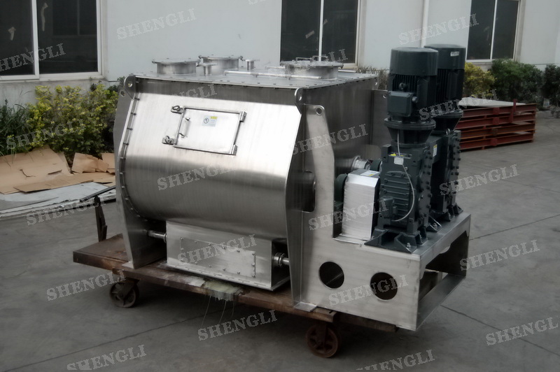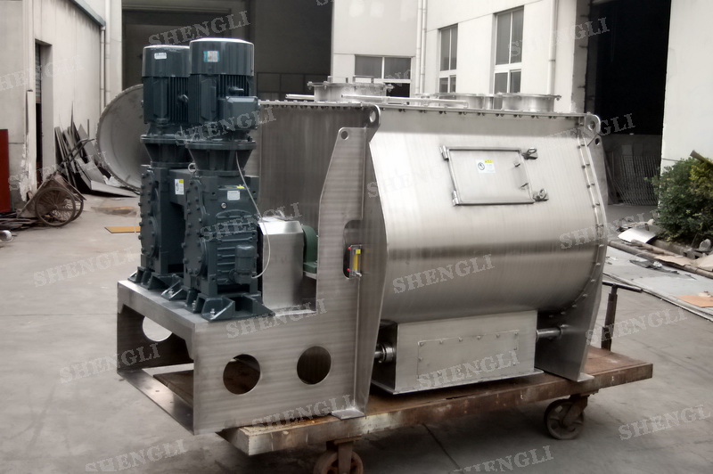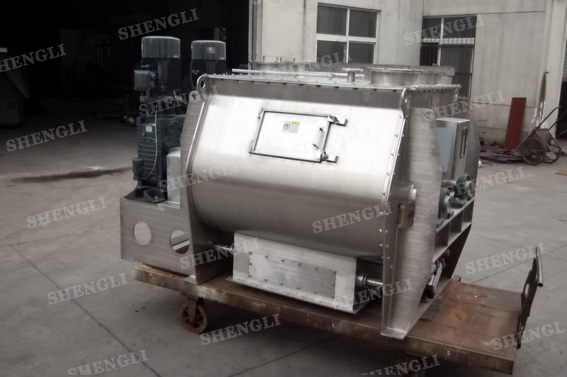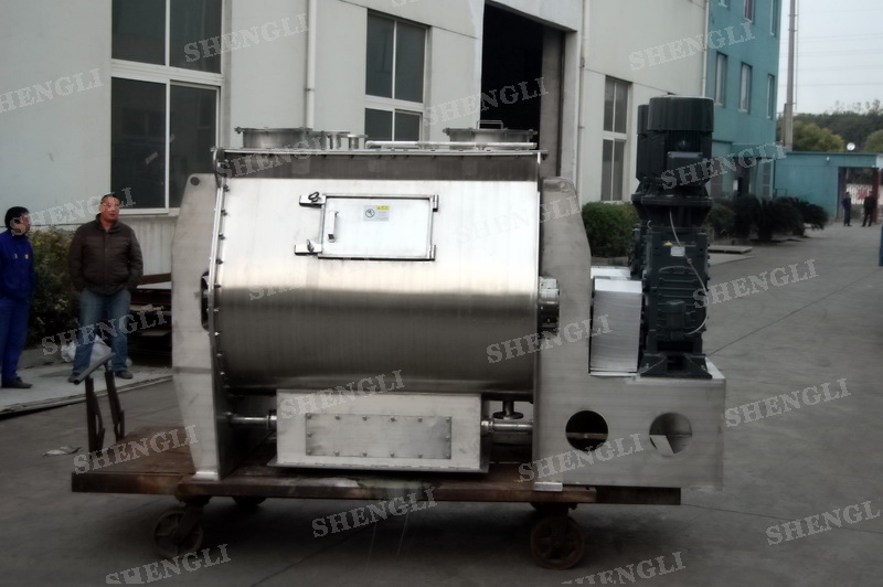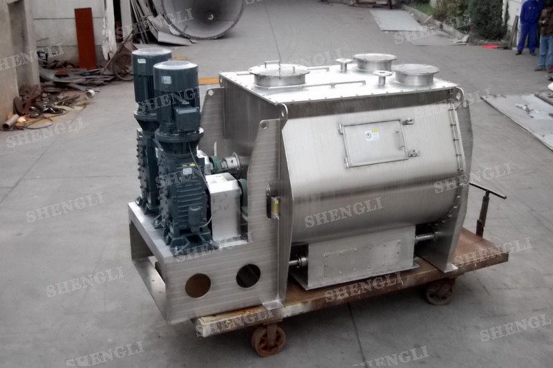 工作原理:无重力双轴混合机采用双U型筒体,内装平行的双主轴,主轴设有对称的多组桨叶,其双轴的运行轨迹部分重合形成啮合空间,双轴在受双电机同步驱动,同步的对称向外翻搅物料,致使物料能够达到瞬间失重点,该设备具备高效物料无差别的混合能力。