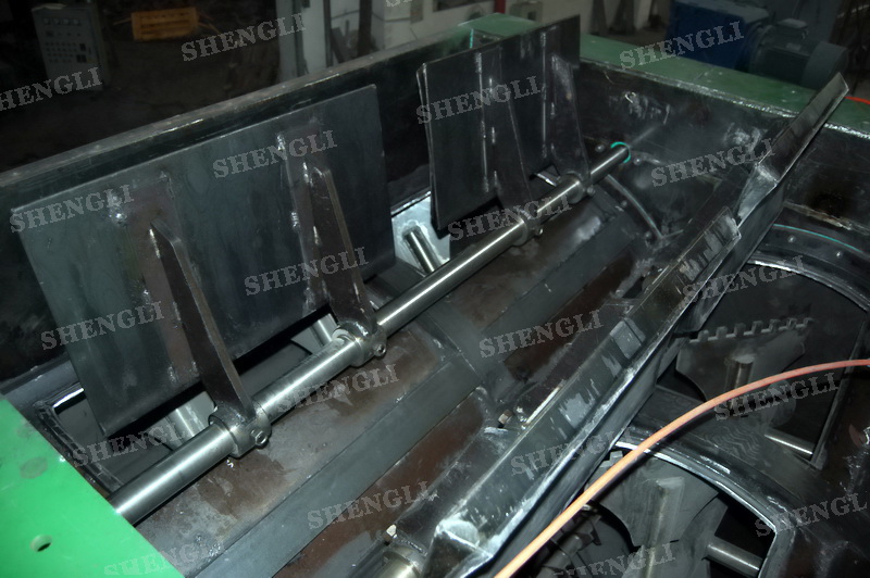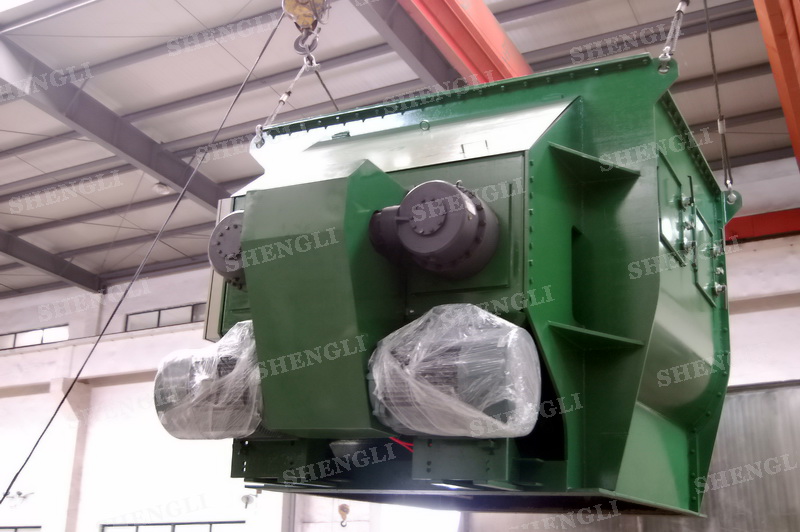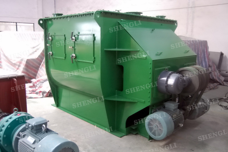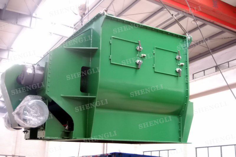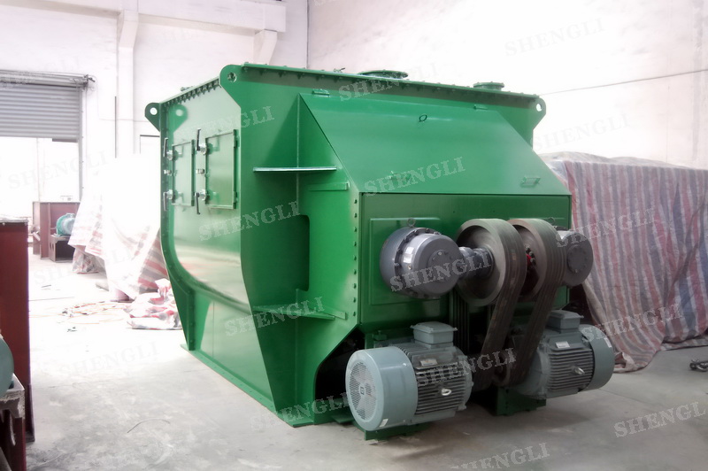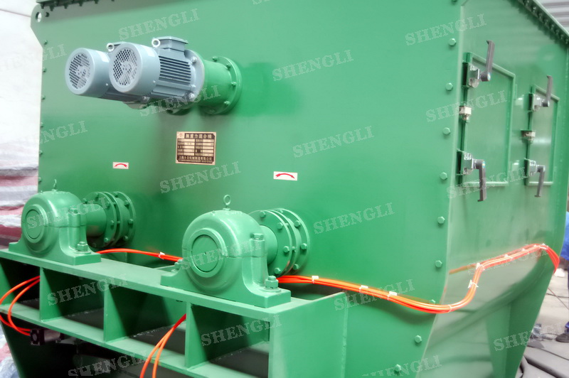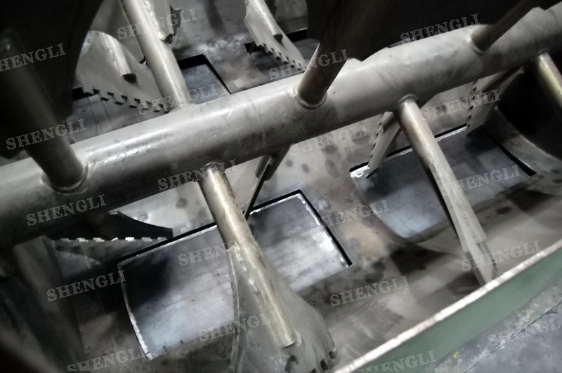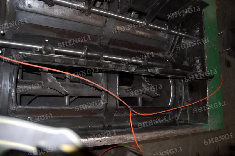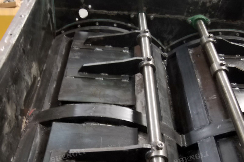 工作原理:双轴搅拌设备采用双U型筒体,内装平行的双主轴,主轴设有对称的多组桨叶,其双轴的运行轨迹部分重合形成啮合空间,双轴在受双电机同步驱动,同步的对称向外翻搅物料,致使物料能够达到瞬间失重点,该设备具备高效物料无差别的混合能力。